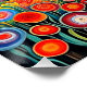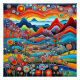 The A.I. created interpretation of a bright and vibrant surreal, psychedelic landscape features rolling hills, mountains, and abstract circular patterns representing flowers.