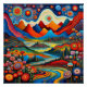 The A.I. created interpretation of a bright and vibrant surreal, psychedelic landscape features rolling hills, mountains, and abstract circular patterns representing flowers.