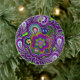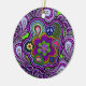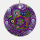 An ornament with a colourful psychedelic design with abstract flowers, a heart, and a peace sign. It's all surrounded by purple paisley.