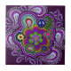 A tile with a colourful psychedelic design with abstract flowers, a heart, and a peace sign. It's all surrounded by purple paisley.