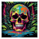 A.I .created print of a vibrant multicoloured skull is surrounded by lush green leaves, creating a striking contrast between natural elements and psychedelic, surreal imagery.