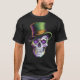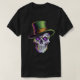 A vibrant, multicolored skull wears a green and gold top hat. The skull’s glowing purple eyes and sharp details create a striking mix of style and eerie charm.