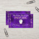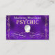 This mystical business card features a psychic theme over a dark purple, foil style background. An image of a crystal ball is placed in the centre, with two banners below it. A sample Palm Readings service is printed across the first banner, and Tarot Cards on the second. You an personalise the business card to include your own custom text. A sample Madame Mystique medium name is printed at the top. The word Psychic is printed in an elegant gold font. The company information is printed on the back.