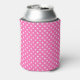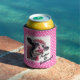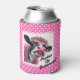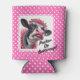 A whimsical and fun can/bottle/seltzer cooler cosy with a pink and white polka dotted background, a dressed up black and white cow wearing pink glasses, pink dress, and pearls. Lace frame around the cow and the saying, Pucker Up Buttercup! in the corner.