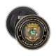 The national emblem of Puerto Rico is at the centre of a circular design. The background colour is a radial black/white gradient, and around the rims of the circles, is a faux gold colour. The text on the design features the official title of Puerto Rico, while the bottom text is the motto, which translates as the Isle of Enchantment.