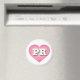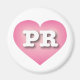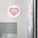 This magnet features a pink heart with a white-washed center containing the bold, white, upper case letters PR, the official abbreviation for Puerto Rico, the isle of enchantment.