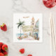 A festive tropical napkin design inspired by Christmas in Puerto Vallarta. This soft watercolor illustration features the iconic church tower, palm trees, beachside café, holiday lights, poinsettias, and Santa flying overhead. The classic postcard-style “Puerto Vallarta” lettering adds a charming travel touch. Personalize the bottom line with your family name or event details. Perfect for Christmas parties, destination holidays, coastal entertaining, and seasonal celebrations in sunny Mexico.