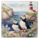 "puffin birds", "black and white puffins", "red coastal lighthouse", "watercolor art painting illustration", "ocean sea animal landscape", "marine coast cute bird", "beautiful painted animals", "pastel flowery floral flowers", "colourful bright spring summer", "summery wildlife"