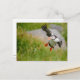Postcard of a flying puffin bird landing at the island of Runde at the Atlantic coast of Norway.