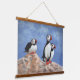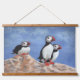 A gouache illustration of three puffins perched on a rocky cliff, set against a vibrant blue sky.