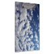 A bank of puffy white clouds breaks into small wispy pieces across the frame of the vertical photograph. The cloud cover is denser on the left and more sparse on the right, revealing a deep blue sky that is dark near the top of the photo and lighter near the bottom. Late afternoon sun highlights the right edges of the cumuli. It looks like torn apart cotton balls suspended in air.