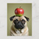Funny Pug with an apple balancing on top of his head.