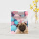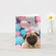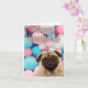 a fun cute pug happy birthday card for those pug lovers in your life. cute pug with blue pink and white balloons in the baground