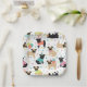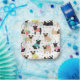 Cute birthday party Pug dogs with black and tan coats dressed in cute birthday outfits with balloons, cake and confetti pattern.