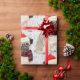 This adorable Pug dog is dressed for the holiday season in a red and black striped winter scarf with Santa hat, and sits against a soft woof word art background.