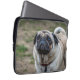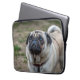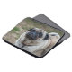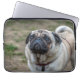A close up photograph of a cute pug dog printed on a laptop sleeve.
