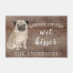 Funny beware of the wet kisser" Pug Dog door mat set on a rustic faux background. Visit our shop to view a large assortment of dog breads
