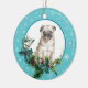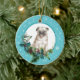 An adorable Pug dog is at the centre of this pretty Christmas ornament. Red berries and pine cones decorate the holly and pine sprigs that adorn the bottom of the portrait. The image is placed on a white circle framed by a blue and white snowflake pattern. The back of the ornament has the same background and circle with your custom text in blue on a white background. Perfect for anyone who is owned by a Pug!