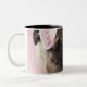 Pug dog with eye mask on head sitting on bed, Two-Tone coffee mug