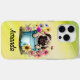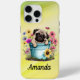 A Cute Yellow Marble iPhone 15 Pro Max Designed With A Pug Puppy In A Pail With Flowers You Can Personalise