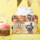 A watercolor-style painting of a cheerful dog sitting amidst a pile of vibrant fall leaves, surrounded by tiny pumpkins and scattered acorns. The dog wears a little pilgrim hat and beams with joy, capturing the spirit of Thanksgiving. In the background, soft harvest fields and golden-hued trees create a peaceful countryside ambiance. Gentle textures and warm, muted autumn tones give the scene a cosy, nostalgic feel perfect for celebrating the beauty of the season.