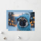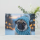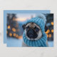 This adorable Christmas card features a cute pug wearing a cosy blue knit hat and scarf, posing against a backdrop of twinkling lights and a snowy landscape. This heartwarming image is perfect for spreading holiday cheer and bringing a smile to the faces of dog lovers and Christmas enthusiasts alike.