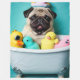 Join this playful Pug as they soak in the suds and unwind in the tub. The cute and quirky design is sure to bring a smile to your face and brighten up any room. Perfect for dog lovers, this charming illustration captures the joy and relaxation of bath time for your furry friend.