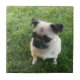 Adorable pug puppy sitting on grass, looking to the side on off centre photograph which leaves room to custom with your own text.