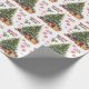 The repeated pattern on this Christmas wrapping paper includes an image of a little Pug puppy sitting in a wicker basket filled with flowers. The basket is decorated with a red bow, and sits beside a Holiday tree. Stylised red and green text says MERRY CHRISTMAS", and your own signature is in two fields for you to customise. Other images included in the pattern include red decorative snowflakes, candy canes, and a peppermint lolly pop.