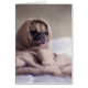 A cute brown and black pug puppy rolled up in a warm brown towel. The background shows a bed in the middle of being changed. His huge eyes and big pouty mouth just beg for a hug. Adorable dog.
