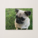 Adorable pug puppy sitting on grass, looking to the side on off centre photograph which leaves room to custom with your own text.