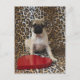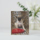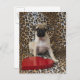 Pug puppy sitting against animal print postcard