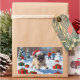 A playful Pug runs through the snowy winter scene, wearing a festive red Christmas hat. This charming design highlights the breed’s wrinkled face, loveable personality, and joyful spirit while capturing the warmth and magic of the holiday season. A delightful winter moment full of festive cheer.
