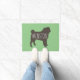 Pug Silhouette Grey and Green Welcome Mat. Personalise with your family name, slogan, or delete the default text if you prefer no text at all. Available in assorted colours. This Pug design makes a wonderful gift for new home owners, newlyweds, dog dads, dog moms, and anyone who loves their pets like family. Visit Jenn's Doodle World for even more dog breed doormats and Pug lover’s home decor.