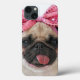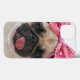 Pug dog with tongue out with a sequined pink ribbon, white background.