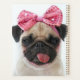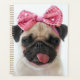 Pug dog with tongue out with a sequined pink ribbon, white background.