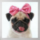 Pug dog with tongue out with a sequined pink ribbon, white background.