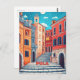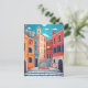 This travel postcard showcases a whimsical illustration representing historic narrow streets of Pula, Croatia.