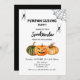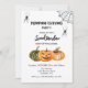 Cute fun and spooky Halloween Pumpkin carving Party invitation featuring watercolor pumpkins and crawly spiders on white background.