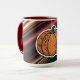 This cute mug displays an orange pumpkin with outlines and sparkly star details. The pumpkin has a green stem and is centred on the front. The background features a burgundy, emerald green and golden colour waves pattern. The mug is a fifteen ounce maroon combo mug. The mug meets the FDA requirements for food and beverage safety. The mug is microwave and dishwasher safe.