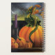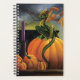 A cute little green dragon sitting on a large pumpkin on a brisk autumn night. Cauldron, spider-web and candle all around the dragon.
