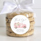 An elegant baby girl shower sticker with "Thank You" in a stylish script with a heart swash, watercolors of a pink vintage truck, pumpkins and floral bouquets and the name of the mother-to-be and shower date in elegant typography.