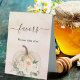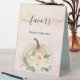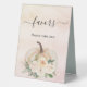 A blush pink and rose gold gradient background, a cream coloured pumpkin and flowers. Text: Favours, please take one.