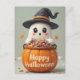 Send ghostly cuteness with this Halloween card featuring a ghost popping out of a pumpkin, complete with a tiny witch hat. Sweet and spooky fun!
