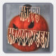 This graphic drawing, has been digitally-edited, to enhance, this vibrant, orange, and black, pumpkin, with menacing, grin-leaning, towards the right, against a blue-grey, background, with Happy Halloween, Emblazoned, across the front, in macabre, pale-coloured, lettering.