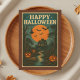 Bats swirl across the sky, a witch’s hat hangs eerily from a tree branch, and the crisp autumn air seems to hum with magic. The rich retro colours—burnt orange, inky blue, and shadowy black—evoke nostalgia and seasonal charm in equal measure.