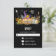 An RSVP card with a cute image of pumpkin and gourd houses with ghosts and bats flying around.