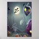 Pumpkin in the spooky forest, many small orange pumpkin, a purple coloured pump at the right side and black pumpkin hovering over the ground. Some spiderweb between some small tree and some bats flying past the moon. This is a AI generated Halloween art.