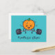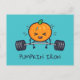 A silly pun which may prompt a quiet exhalation of amusement. A pumpkin pumping iron of course.
