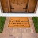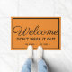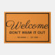 Give a warm yet funny welcome to your guests with this personalised welcome door mat design. Design has a look of a simple welcome mat until closely read that it discourages guests from overstaying their visit. Words read "welcome don't wear it out" with family name and est. date below them. Design features a pumpkin orange background with black calligraphic and modern lettering. A black border encases the letters on the mat. Design by © Ms_Jade. Shop other fun designs in my Zazzle store at www.zazzle.com/Ms_Jade*